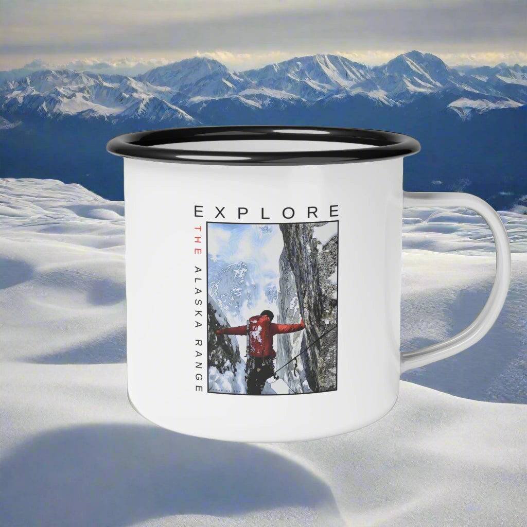 This enamel camp mug features a design of a solo climber near Anchorage Alaska. The cook inlet is seen on in the background as Balin...