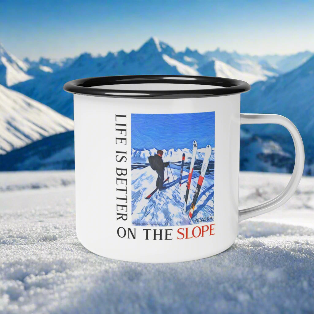 Life is better on the slopes with this enamel mug inspired by a photograph of Balin Miller Skiing in Tincan Turnigan Pass Alaska. Pe...